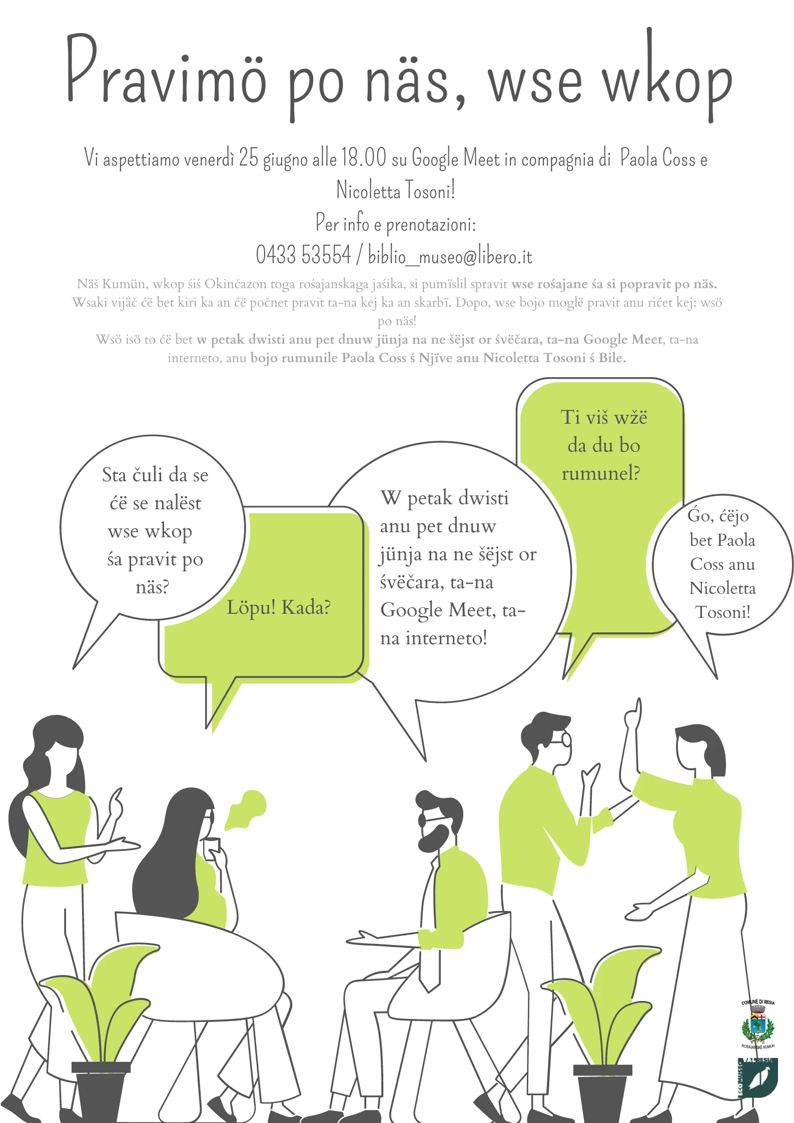 Quinto appuntamento con l’iniziativa “Pravimö po näs, wse wkop”, venerdì 25 giugno 2021, alle ore 18.00, nel giardino della Biblioteca Comunale di Stolvizza.