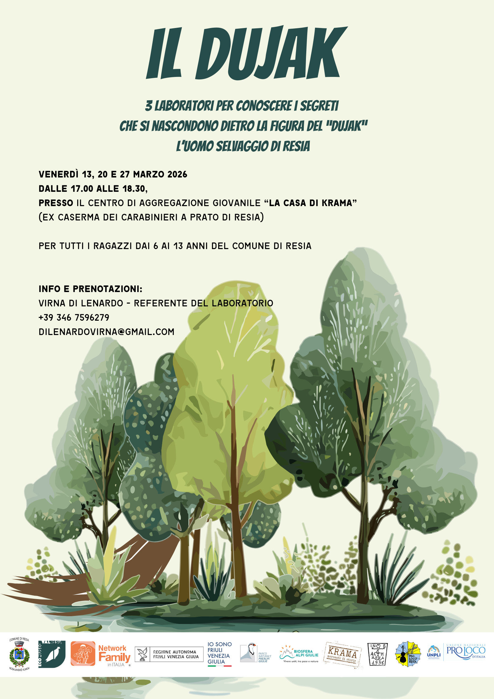Già dal mese di marzo saranno attivati tre laboratori, destinati a bambini e ragazzi dai 6 ai 13 anni, per scoprire dalla voce di adulti ed anziani chi è il Dujak: aspetto, carattere e vicende.