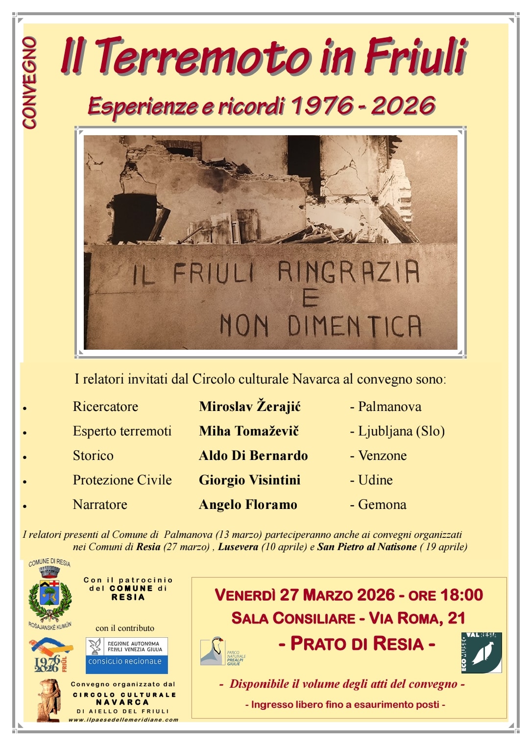 Il Comune di Resia apre la serie di iniziative volte a ricordare il 50° anniversario del disastroso terremoto che, tra il 6 maggio e il 15 settembre 1976, colpì il Friuli ospitando il Convegno “Il terremoto in Friuli: Esperienze e ricordi 1976-2026” organizzato dal Circolo Culturale Navarca di Aiello del Friuli.